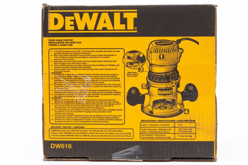 Potencia 1-3/4 HP 120V Diámetro del Collet 1/4", 1/2" ; Velocidad 24.500 RPM: Incluye Bolsa recolectora de polvo; Base con cono asegura centrado perfecto de la fresa para cortes y rebajados exactos y precisos; Rebajadora modular de motor y base de acople fácil y rápido ofrece ajustes de profundidad y cambios de base rápido y fácil; Cable desmontable de fácil mantenimiento; Anillo de ajuste ultra-fino de la profundidad de corte en incrementos de 1/64" permite cortes exactos