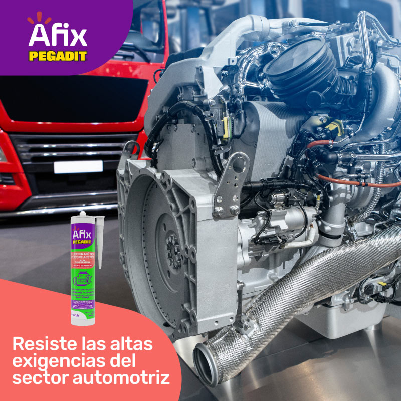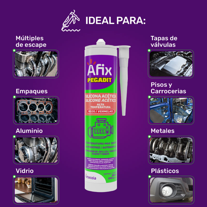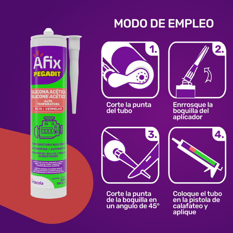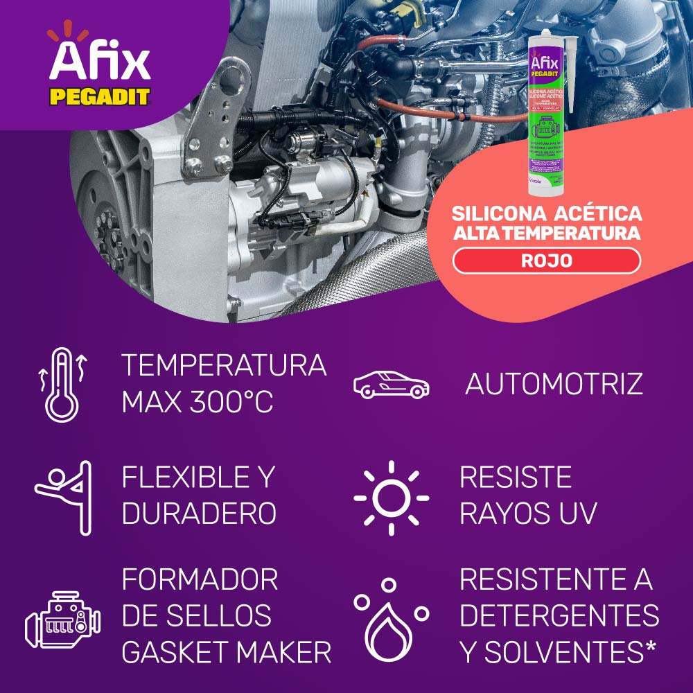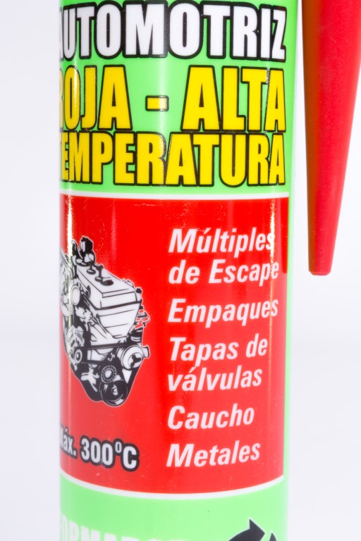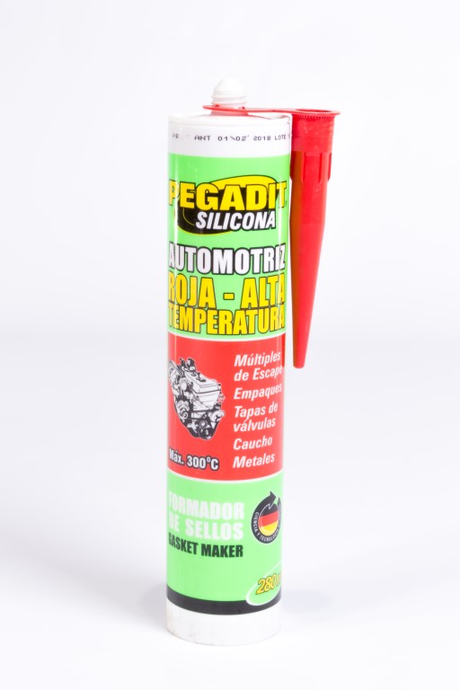 Silicona de alta temperatura de color rojo, diseñada para la industria automotriz para sellar empaques resitentes y herméticos, múltiples de escape, tapas de válvula, cauchos y metales. Referencia 0402821 de Pegatex