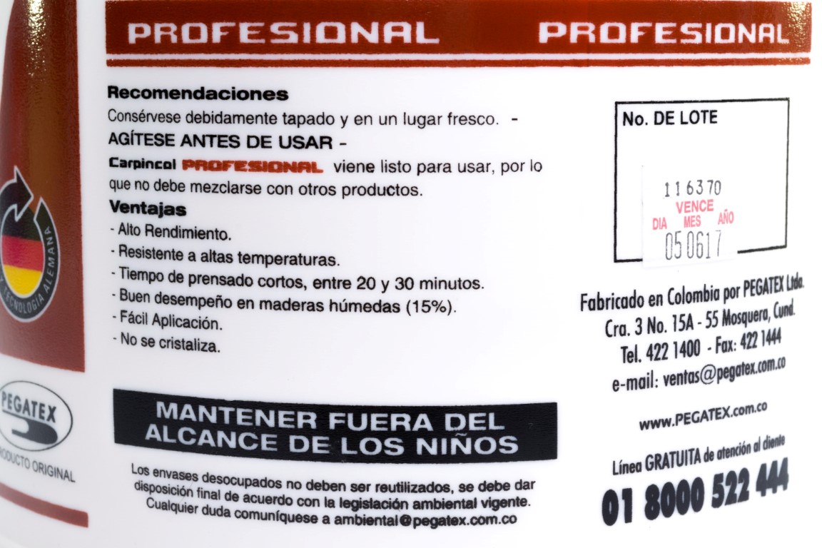 Adhesivo de envase plástico con dosificador elaborado a base de PVA (acetato de poli vinílico), para la industria de la carpintería y madera. Utilizado en maderas con un porcentaje de humedad y es de secado rápido.