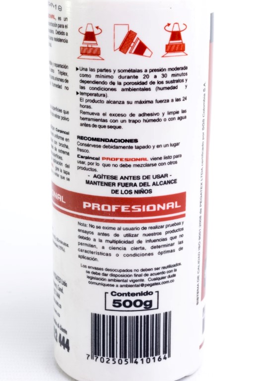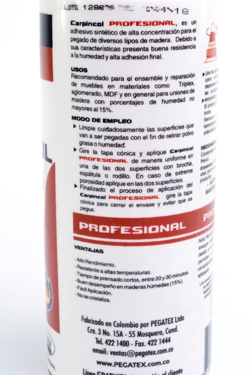 Adhesivo de envase plástico con dosificador elaborado a base de PVA (acetato de poli vinílico), para la industria de la carpintería y madera. Utilizado en maderas con un porcentaje de humedad y es de secado rápido.
