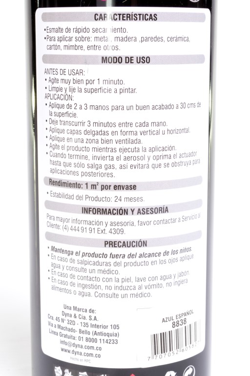 Pintura en aerosol multipropósito de acabado brillante, ideal para aplicar en diferentes superficies como madera, metal, cerámica o concreto. Fácil aplicación y rápido secado. Rendimiento aproximado de 1m2 por envase. Alta adherencia y cubrimiento. Presentación de 400 ML. Referencia 8838 Pinte.