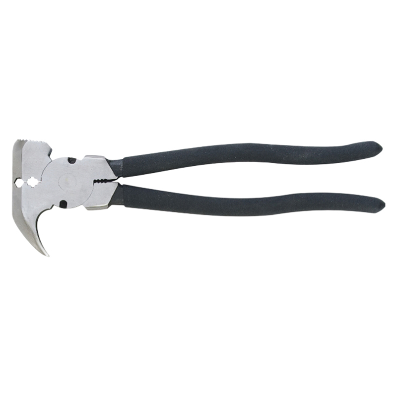 Alicate hacendado. Fabricado en acero de herramientas. Mango negro rugoso para operación segura. Útil para corte de alambre y grapas, ideal para instalación de alambre de púas.