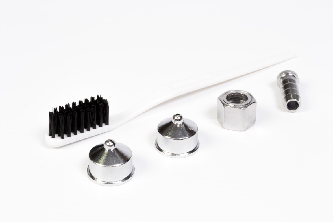 Alto consumo de aire, desperdicio de pintura (35% aprox) baja presión de trabajo, Presion maxima 45 PSI, presion optima 35 a 45 PSI, diametro de boquilla 0,8 mm. Vaso de 750 c.c. No apto para químicos altamente corrosivos.