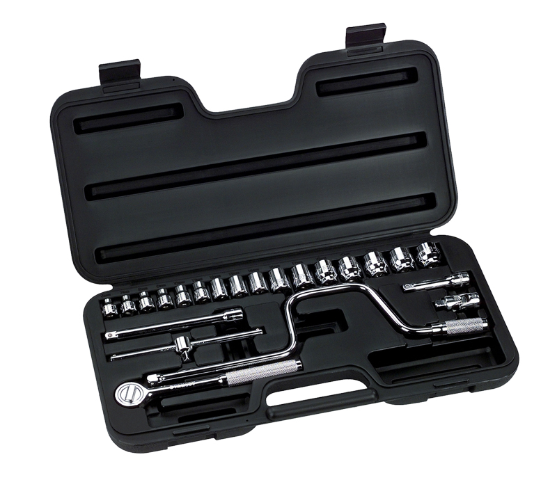 23 Piezas · Contenido · (1) 3/8 pul Ratchet · (2) 3 & 6 pul Extensión · (16) 6, 7, 8, 9, 10, 11, 12, 13, 14, 16, 17, 18, 19, 20, 21 & 22 mm Dados · (1) Barra Deslizante “T” · (1) Junta Universal · (1) Mango Berbiqui · (1) Caja Almacenaje