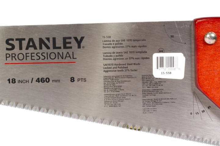 [95-IB] 15-558. 7 DPP Dientes por pulgada (8 PPP puntas por pulgada) · 18 pul Largo-Hoja (457 mm) . Gráfico de 3 colores en la hoja contiene información de producto, incluyendo el código de barras. Cobertura plástica protege los dientes del serrucho antes y después de la compra como también mejora la presentación en el punto de venta. Dientes con geometría especial para un corte rápido. El mango puede usarse como escuadra de 45° y 90°. Lamina de acero templado SAE1070. Dientes afilables, trabado y pulido.