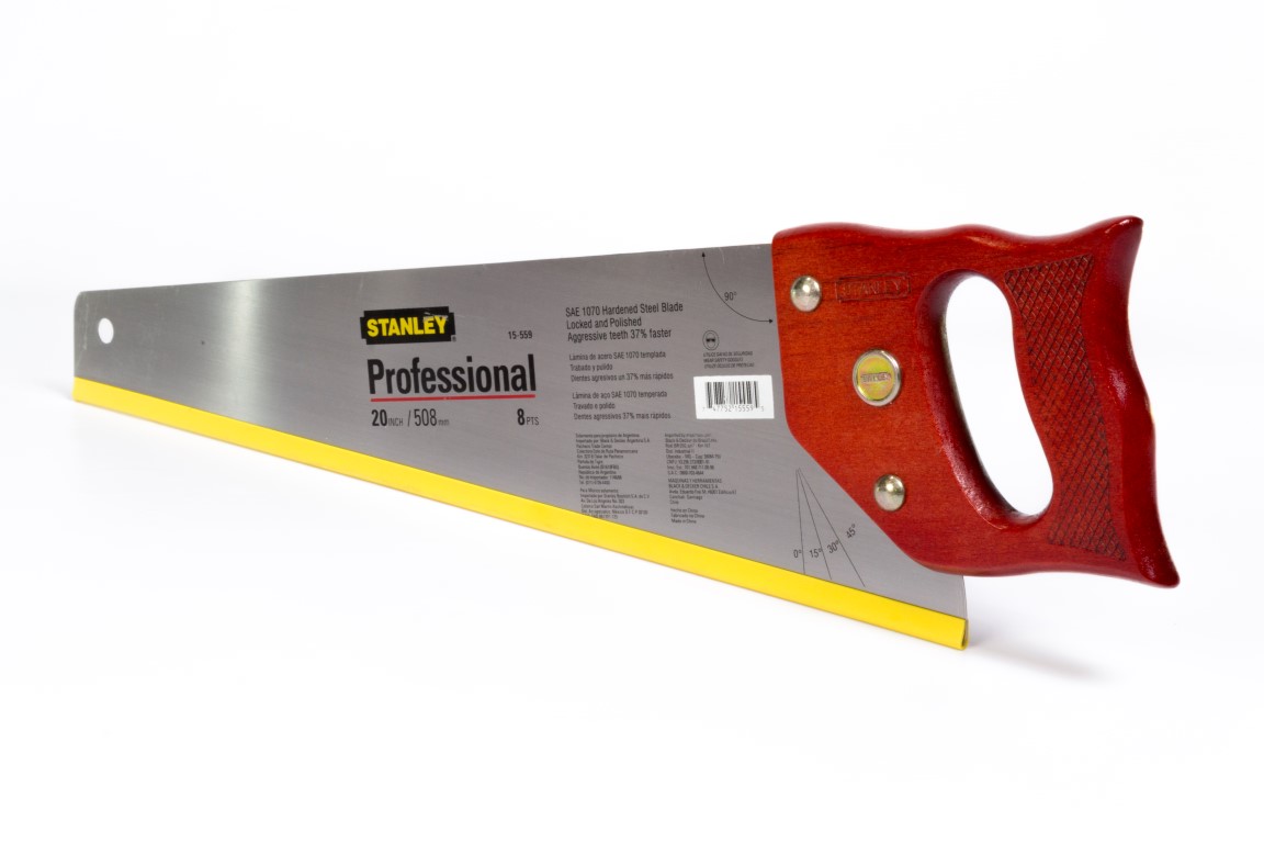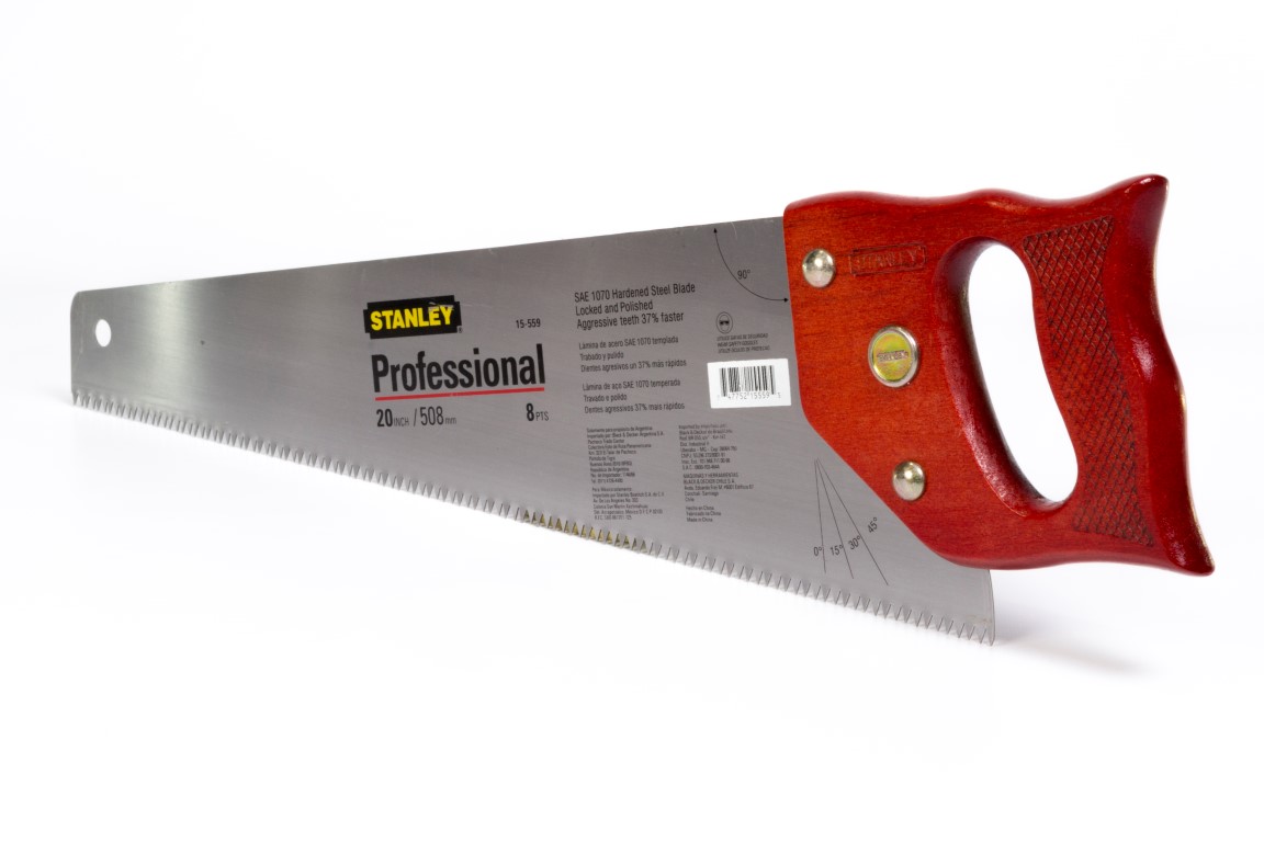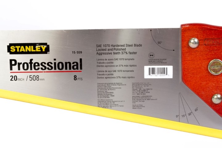 95-IB] 15-559. 7 DPP Dientes por pulgada (8 PPP puntas por pulgada) · 20 pul Largo-Hoja (508 mm) . Gráfico de 3 colores en la hoja contiene información de producto, incluyendo el código de barras. Cobertura plástica protege los dientes del serrucho antes y después de la compra como también mejora la presentación en el punto de venta. Dientes con geometría especial para un corte rápido. El mango puede usarse como escuadra de 45° y 90°. Lamina de acero templado SAE1070. Dientes afilables, trabado y pulido.