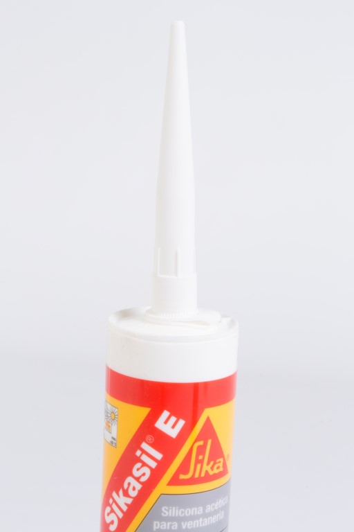 Sikasil - E es una silicona acetica monocomponente, de bajo modulo que cura con la humedad del ambiente. Adecuada para aplicaciones en interior y exterior. Ideal para ventanería. Antihongos de uso general. Se usa para el sellado de juntas en superficies no porosas como vidrio, cristal, acrilicos, policarbonatos, tejas, ceramica, aluminio y materiales no oxidables.