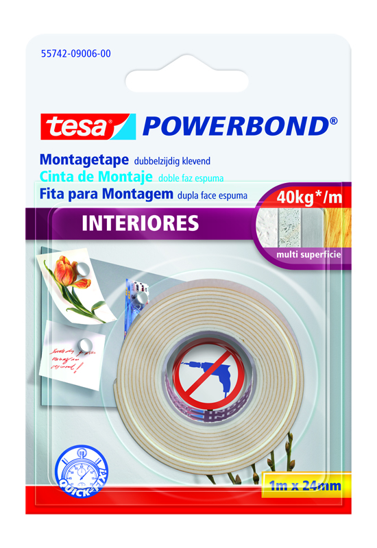 Cinta doble faz de uso interior para el montaje permanente de objetos sobre superficies lisas y rugosas. Soporte de espuma y adhesivo de caucho sintético para una fuerte adhesión de objetos planos con pesos de hasta 4 kg por cada diez centímetros de cinta. Resistente al deslizamiento. Excelente fuerza de cizallamiento y resistencia a las cargas. No se amarillea con el tiempo.