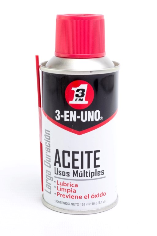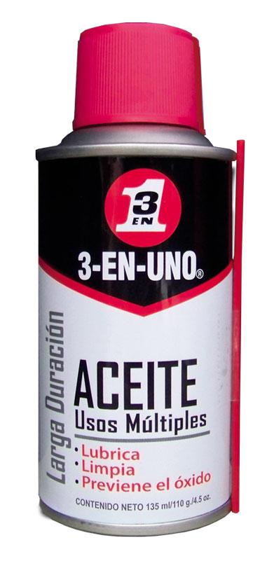 EL ACEITE 3-EN-UNO® AEROSOL es un aceite con formulación de acción triple provee una barrera protectora contra la oxidación, la corrosión, reduce la fricción, remueve los residuos y ayuda a limpiar las superficies de los metales. Su presentación en aerosol le permite llegar con el tubo extensor a lugares de dificil acceso