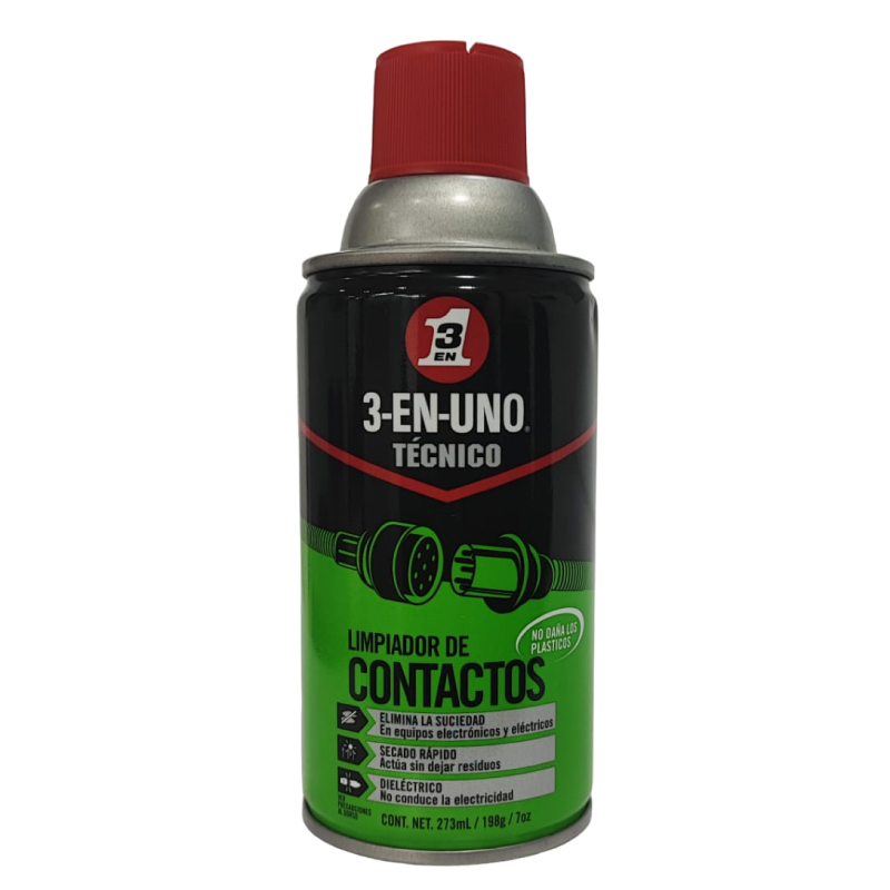 El limpiador de contactos aerosol elimina eficazmente y sin dejar rastro, todo tipo de aceites, grasas, depósitos de óxido y suciedad, huellas dactilares, etc., restaurando la continuidad eléctrica en todo tipo de contactos eléctricos y electrónicos. Penetra fácilmente en superficies secándose rápidamente sin dejar residuos. Es dieléctrico y no daña los plásticos.