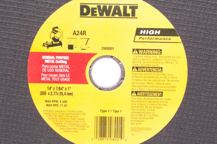 Grano de óxido de aluminio de alto rendimiento para una larga vida útil y un corte rápido. La alta concentración de grano para un corte agresivo. Mezcla de material que asegura la larga vida de las ruedas. Dos películas completas de fibra de vidrio para una mayor durabilidad y seguridad. Disco de metal ideal para barras de acero y perfiles. Disco tipo 1 de 14"" (355mm) X 7/64pg (2.77mm) X 1pg (25.4mm). Velocidad Máxima: 4.300 RPM.