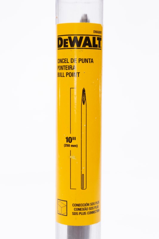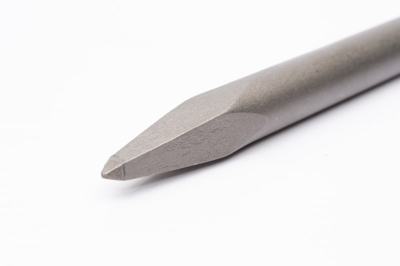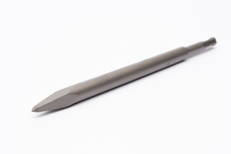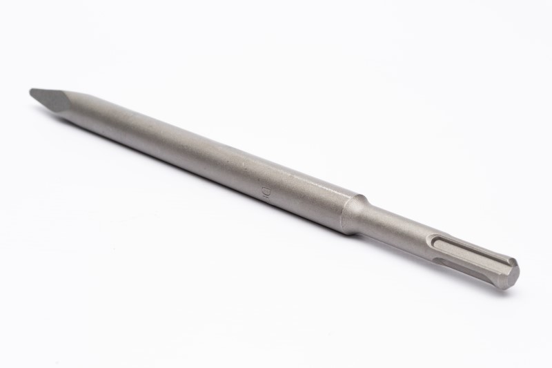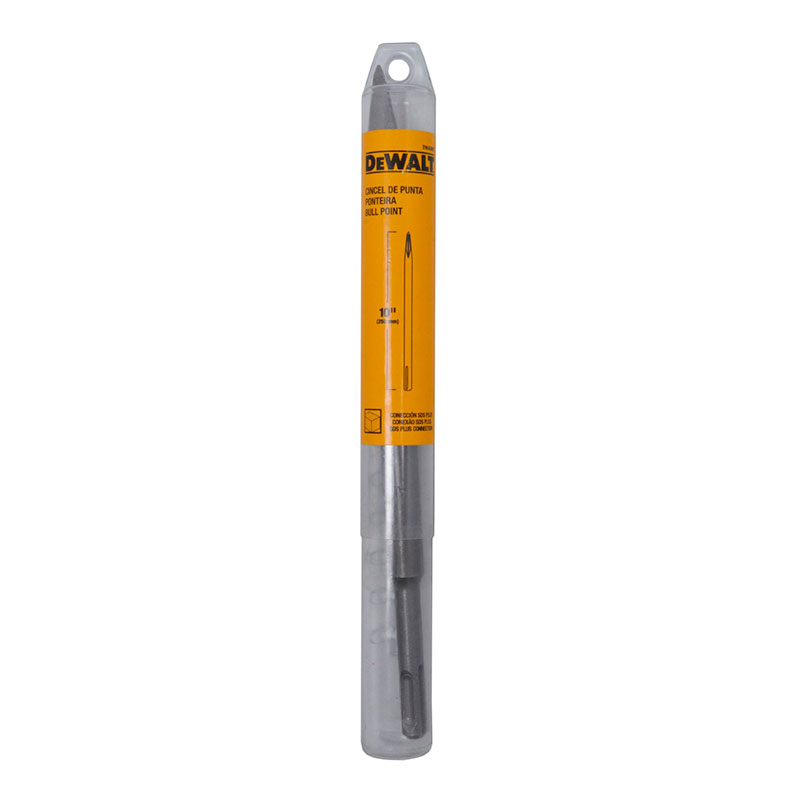 El cincel DE PUNTA utilizado en Rotomartillos con el encastre: Sds Plus. Largo total: 250mm (10"). El cincel es usado en construcción para ranurar, y remover salpicadura de cemento y otros materiales.