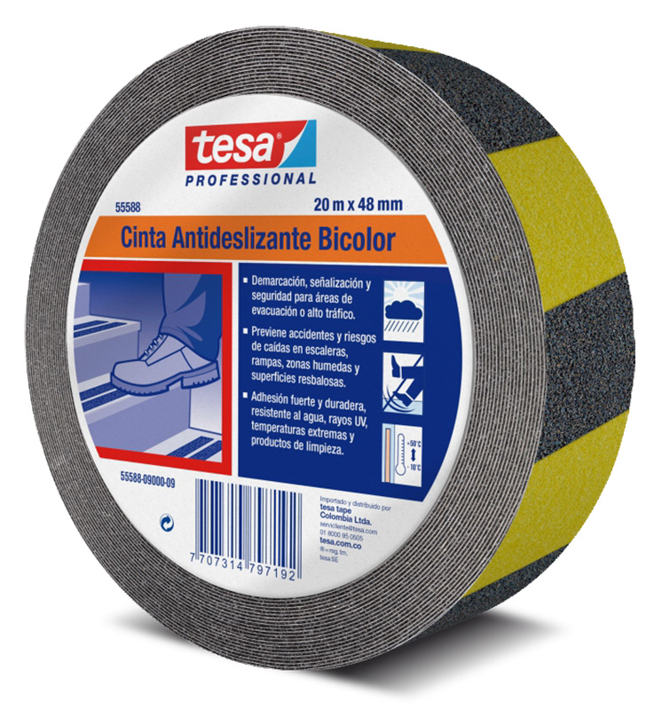 Cinta Antideslizante Amarilla Negra. La combinación de color amarillo-negro permite identificar áreas de alto riesgo. Resistente a la humedad, el calor y los químicos. Apta para aplicaciones en interiores o exteriores. 2 años de vida. Alto poder adhesivo. Medida 48 mm x 20 mts. Referencia 55588-09000-09 de Tesa.