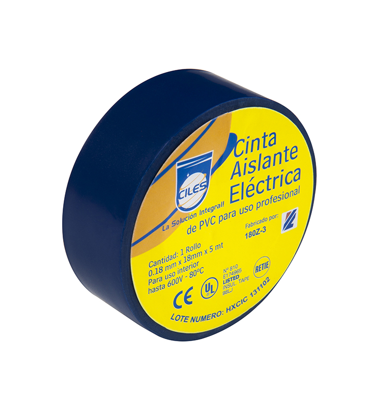 Cinta asilante eléctrica de PVC para uso profesional en trabajos de baja tensión y en interior. Soporta hasta 600V a 80°C. Medidas: 0,18mm x 18mm x 5 mts. Cumple RETIE. Color azul. Referencia 842300A de Ciles.