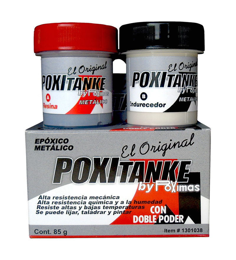 "POXITANKE METÁLICO POXIMAS es un adhesivo de dos componentes,Resina y Endurecedor, los cuales deben ser mezclados para obtenerun producto que endurece en veinticuatro horas. Al endurecer retienesu forma sin contraer ni dilatar. Es resistente a altas y bajas temperaturas,a la humedad y a la mayoría de solventes, ácidos y álcalis. No corroe losmateriales. Es resistente a altas y bajas temperaturas y a la humedad. Elpegue es rígido y de color gris metálico. Presentación metálico x 85 gramos. Referencia 1301038 de ITW"