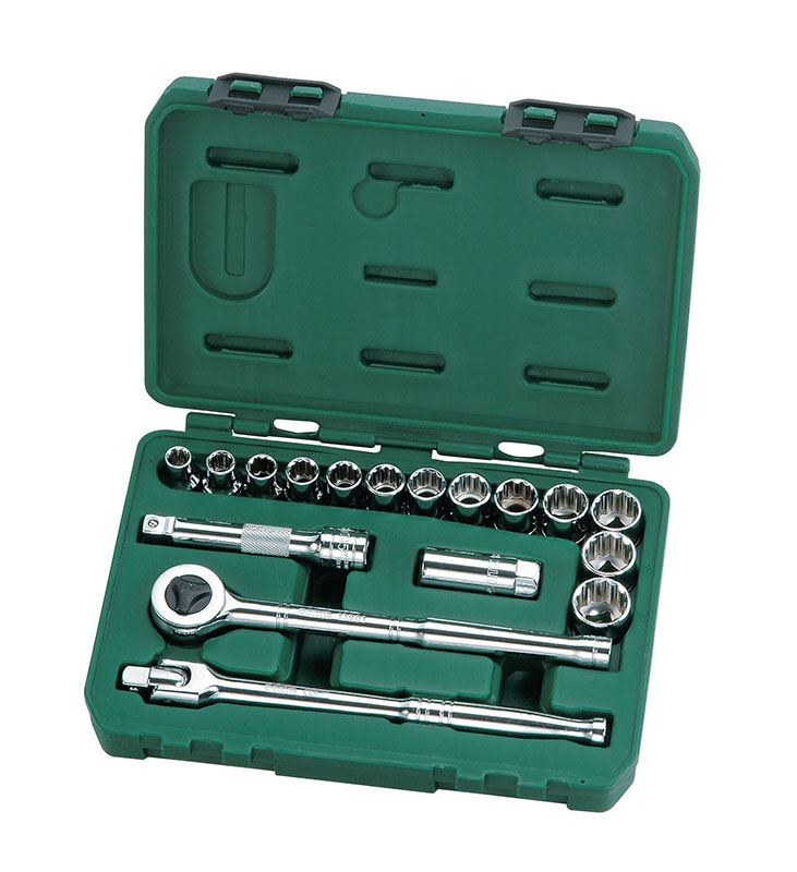 Contiene Dados Métricos 10, 11, 12, 13, 14, 15, 16, 17, 18, 19, 21, 24mm. 1 Dado para Bujías. Ratchet de Desacople Rápido. Extensión Dual 5". Mango Articulado 10". Copa con paredes de poco espesor con tratamiento térmico. Aleación en cromo vanadio que permite una alta resistencia. Recubrimiento en cromo niquelado que evita la oxidación. Rayado en el cuerpo de la copa para fácil identificación. Marca bajo relieve. Las copas cuentan con la tecnología Surface®Drive de SATA que protége tanto la herramienta como el cuadrante de las piezas roscadas que se ajustan con ellas.