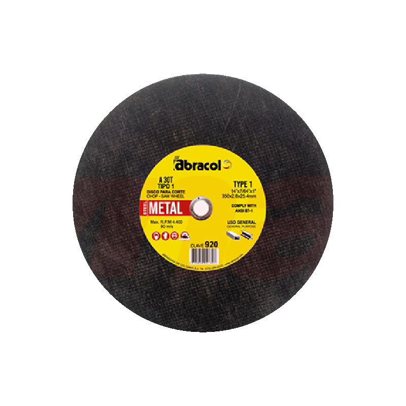 ABD1A0030146. Disco Abrasivo Plano T1 de corte de metales, para trabajar en maquina tronzadora con 2 fibras internas que permite un corte mas rapido, menos rebaba en el material. disco de alto desempeño con grano en oxido de aluminio 30. Dimensiones 14" (355mm) x 7/64" (2.8mm) x 1" (25.4mm)