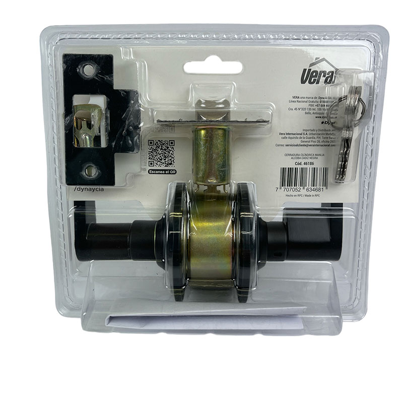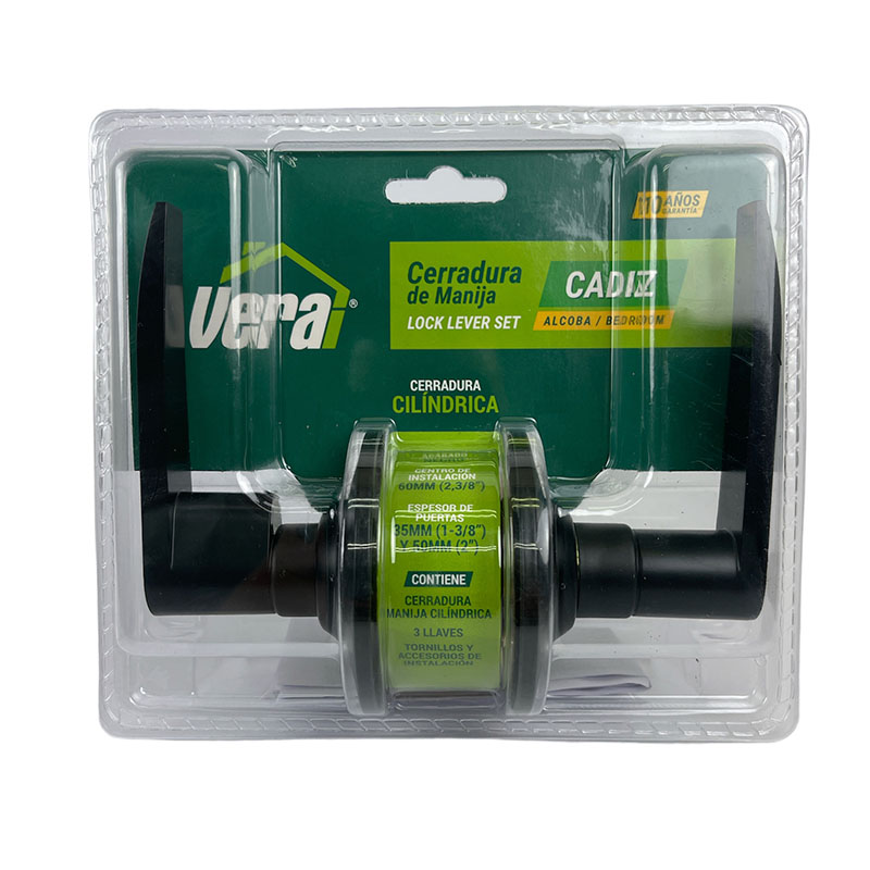 Cerradura Cilíndrica con Manija Metálico en Acabado Negro, Diseñada para brindar seguridad y elegancia, esta cerradura cilíndrica cuenta con un elegante acabado en negro, aportando un toque moderno y sofisticado. Su cilindro de zamak, disponible en versiones para alcoba y entrada, garantiza un mecanismo confiable y duradero. Con un centro de instalación de 60mm (2-3/8") y roseta de 65mm, es compatible con puertas de 35 a 50mm de espesor, permitiendo una instalación sencilla. Incluye 3 llaves de acero con acabado niquelado. Hasta 85000 mil ciclos, empaque blister