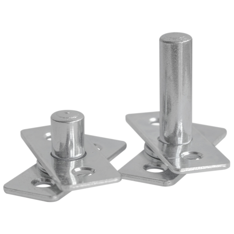 Bisagra pivote fabricada en lámina de acero cold rolled calibre 12, para utilizar en puertas entamboradas que abren en ambas direcciones como cocinas y pasillos, eje en acero 12L14 brinda mayor estabilidad en puertas que superan los 1.80m de altura, mayor profundidad de alojamiento de la puerta al eje de la bisagra.