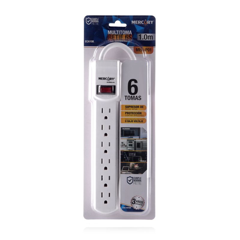 Multitoma de 6 salidas con cable de poder 0,9 metros 3X14AWG. Ideal para uso industrial y residencial. Garantia 1 año