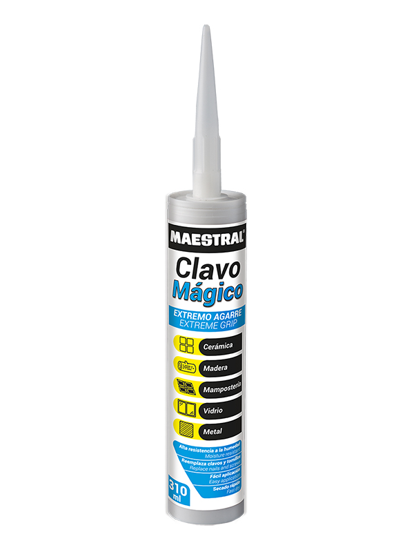 El clavo magico maestral es un adhesivo creado para la fijacion de adornos de icopor, madera y corcho. colocar ceramicas sueltas, alfombras y baldosas de vinilo. fijar objetos de construccion prefabricados, molduras de poliuretano, marcos, vidrios. pegar accesorios de bano y cocina, etc.